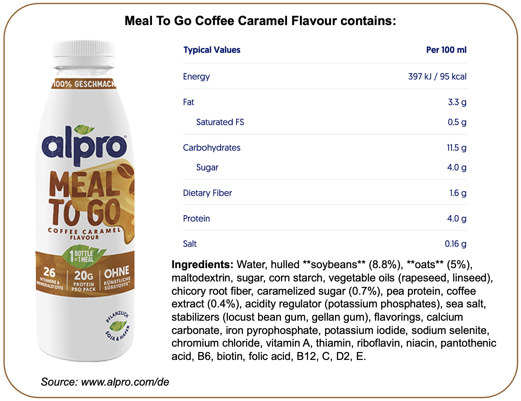 Danone is the newest entrant, leveraging its Alpro brand - Europe's biggest plant-based dairy alternative brand - to create Alpro Meal To Go, a plant-based drink positioned as "a nutritionally complete, ready-to-drink meal" in a 500 ml bottle.