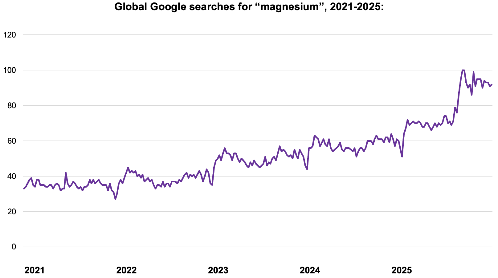 Magnesium is becoming increasingly trendy, with consumers discovering its potential to improve sleep, stress, muscle recovery and more. As the below chart shows, global searches for “magnesium” have grown steadily over the past five years on Google. Looking at other channels, online data analysis company Glimpse Analytics reports a 44% increase in search interest in the past year across TikTok, Instagram and Facebook.